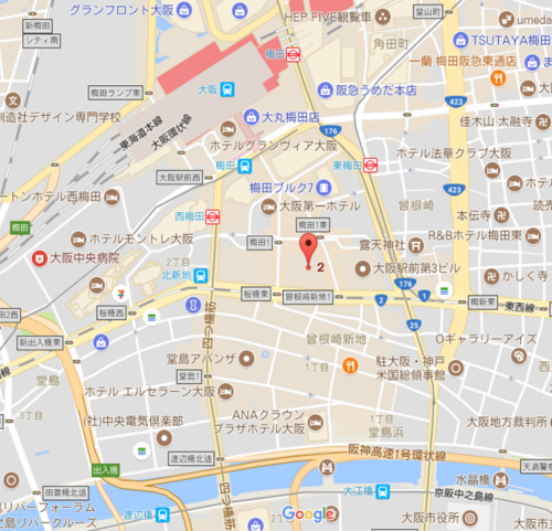 大阪駅前第二ビル、中央階段を上がって2階、北側通路西へ15メートル南側です。